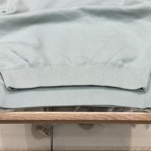 春夏シーズンのスウェットといえば軽いウェイトの物を入荷前は想像しておりましたが、店舗に届いていざ封を開けて触ってみると、モチッとした質感で生地のウェイトも感じます。
