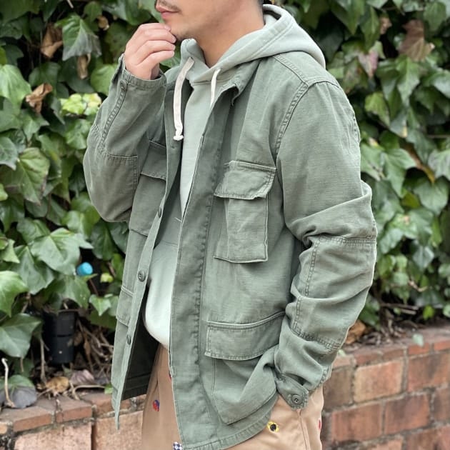 もう一つオススメしたいのが、ミリタリーブルゾンに代表とされるようなオリーブドラブとの組み合わせ。ヘリンボーンキャンバスやバックサテン・リップストップなど、BLUE×DENIMの組み合わせのように、無骨なアイテムでも程良く中和してくれるかなと思います。