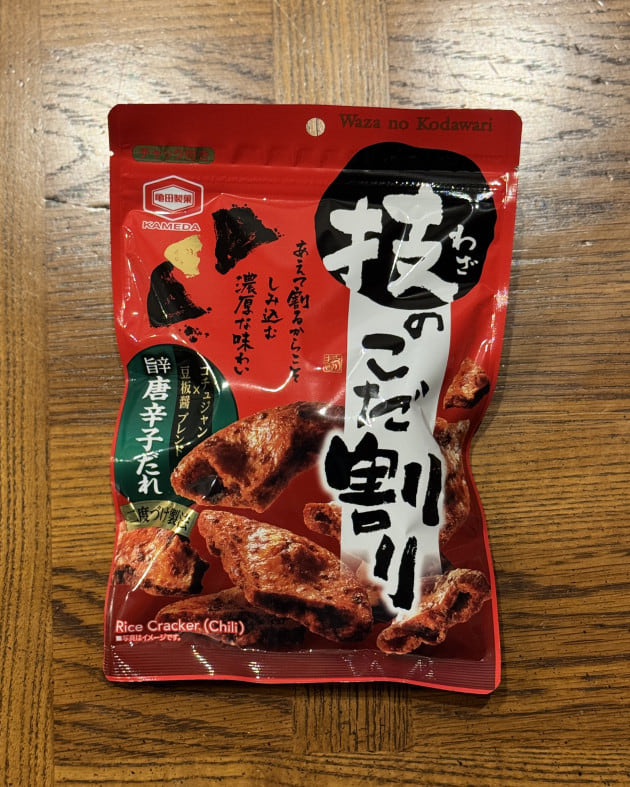亀田製菓の技のこだ割りです。おすすめする味は既に販売終了しているらしいですが、定番ラインナップで2種並んでいました。実際に食べてみたら美味しい。ヤミツキです。