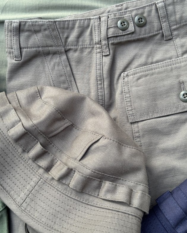 こちらのパンツは生地に洗い加工が施されていますが、ハットに関しては未洗いでございます。