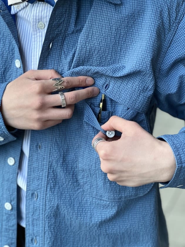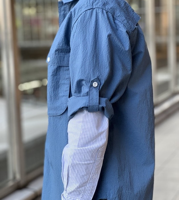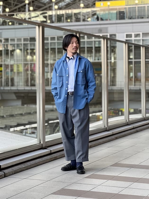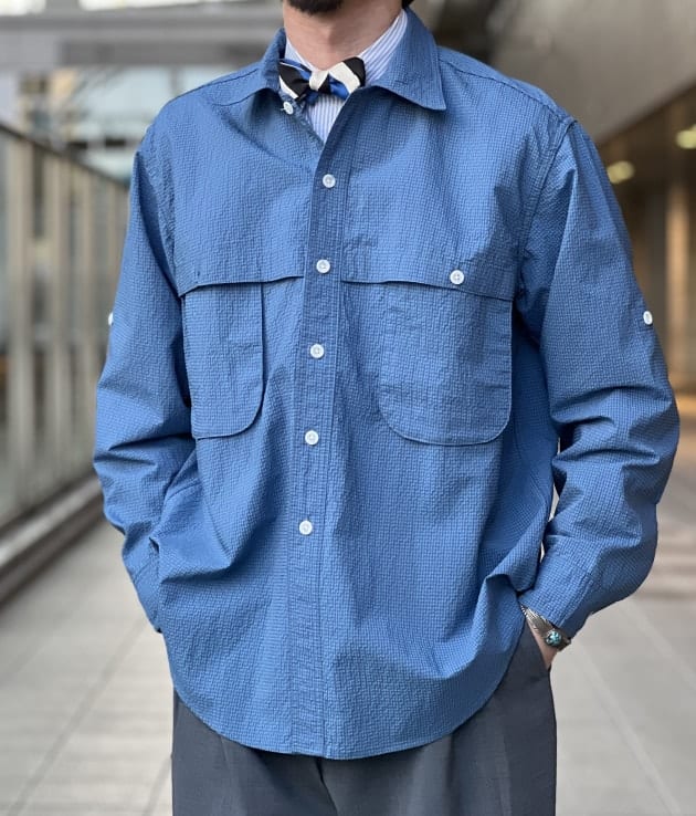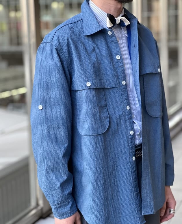 ハンティング由来なシャツですが、素材も相まって土臭くなりすぎず、清涼感のあるスタイルを演出出来ますね。