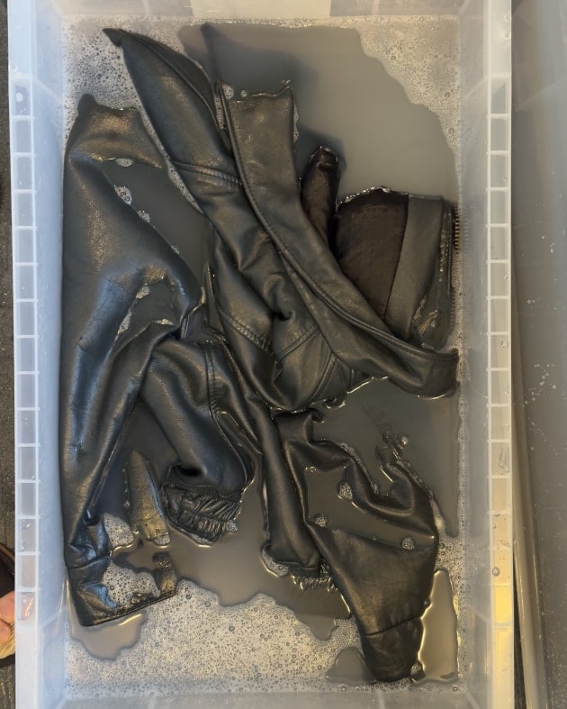 60-70度のお湯と革製品専用の洗剤で強めに揉み洗い、脱水、デリケートクリームを入念に塗り込み、裏返しで日陰干し。