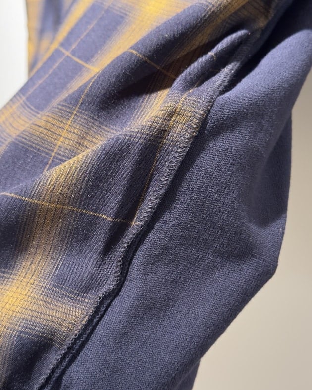 カットソーのような縫い目があり、裏地・襟・袖・裾リブ部分がニット地、前見頃はオンブレチェック柄の布帛が使用されているのです。