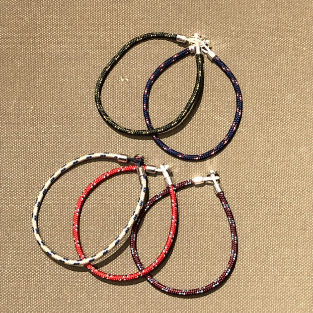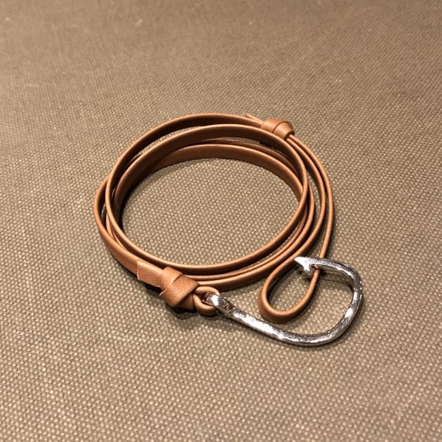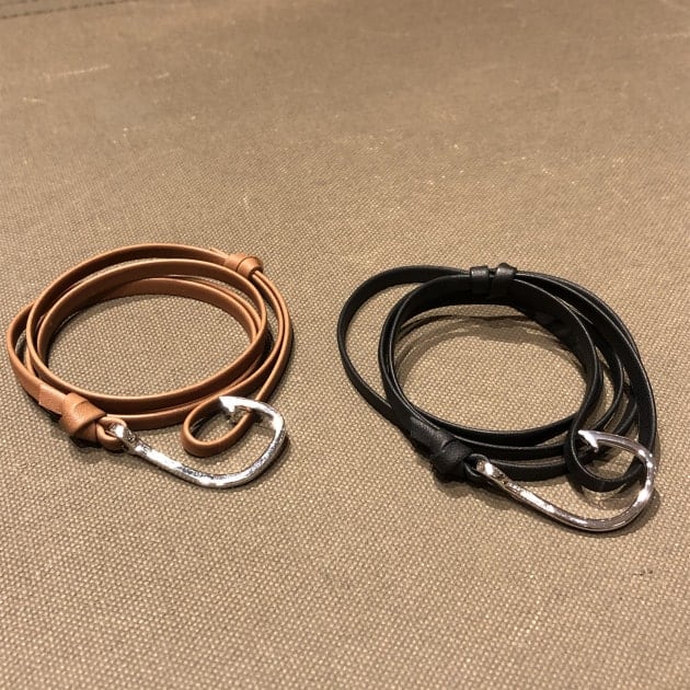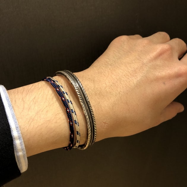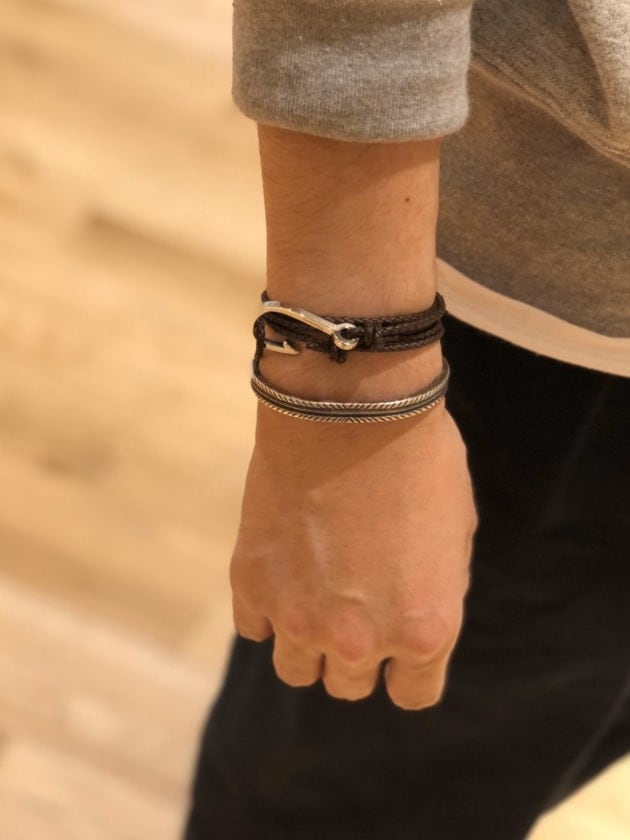 編み込みのレザーロープが細くスマートに仕上がっていますので、私はシルバーバングルと重ね付けしボリュームを出してみました!