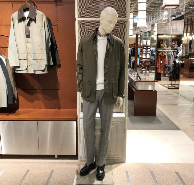着用している<Barbour>は別注シェイプメモリー素材、BEDALEのスリムフィットモデル。ご存知の方も多いとは思いますが、シェイプメモリー素材は、シワになりにくく、撥水性を備えた高機能素材。もう少し暖かい季節になりましたら、バサッと羽織れて、暑い時にはシワを気にせず収納出来る便利な1着ですね。