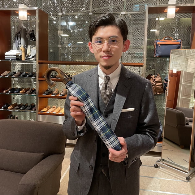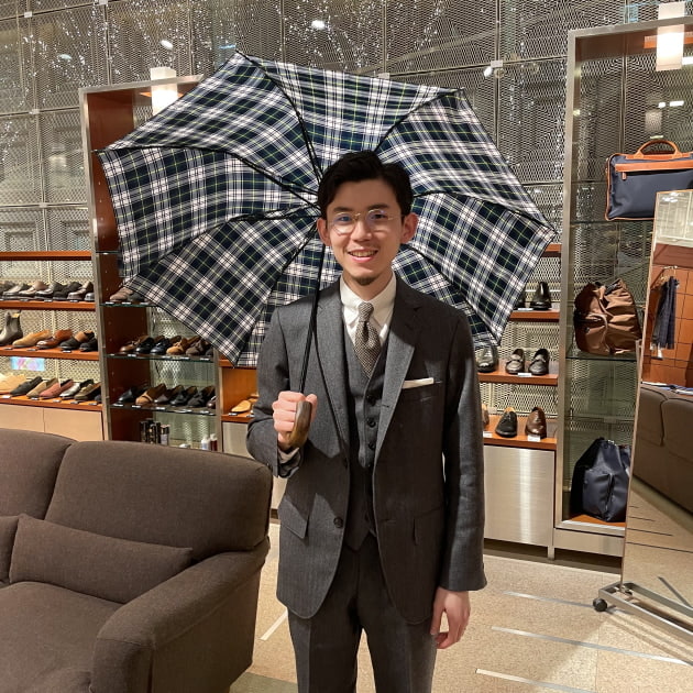 高級感のあるウッドハンドルとモダンなチェック柄の折りたたみ傘。急な悪天候や雪の日にも‥軽量で持ち運びにも適しています
