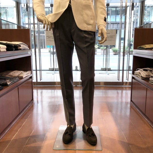 パンツは写真ではわかりにくいですが、<GTA>定番HERRICKのトロピカルウール素材。フレスコのウールパンツでも良さそうですね。パンツのカラーはチャコールグレーではなく、やや明るめのグレーがおすすめです。