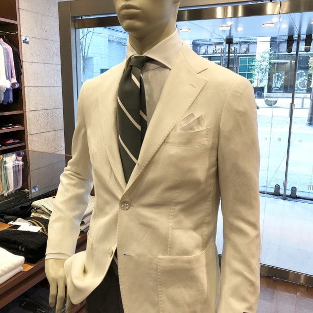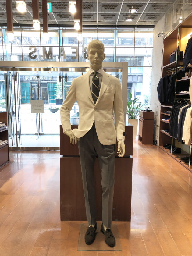 ホワイトカラーのジャケットというと、ノータイでリラックスしたコーディネートを連想される方が多いかもしれませんが、こちらはタイドアップの比較的真面目な印象のコーディネート。