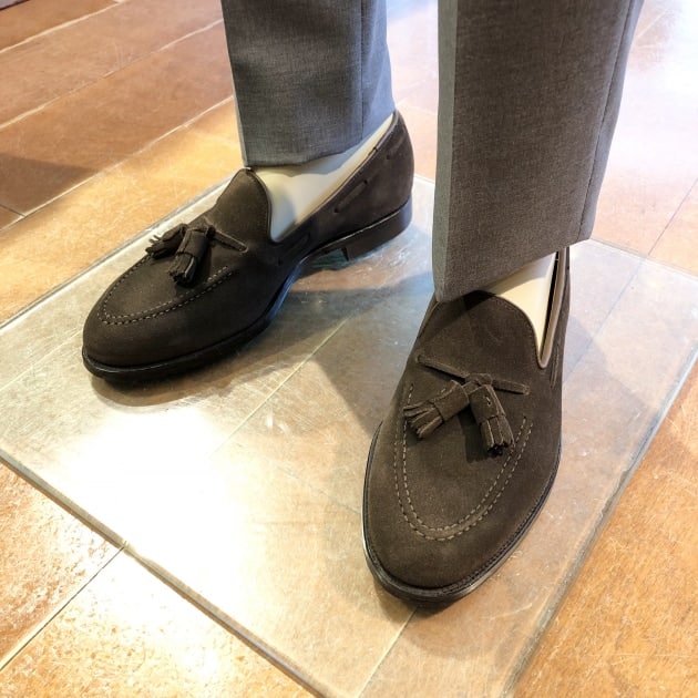 足元はダークブラウンスエードの定番タッセルローファー。もう少し明るい印象のVゾーンであったら、明るめのブラウンスエードを合わせてもとても格好良さそうです。