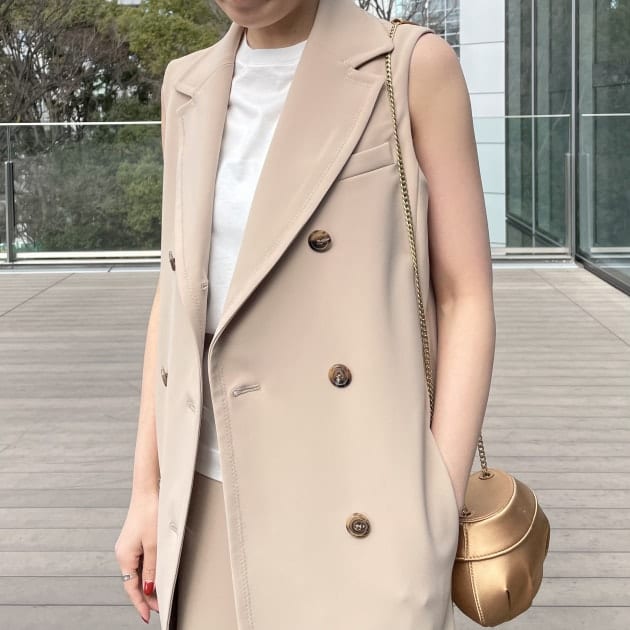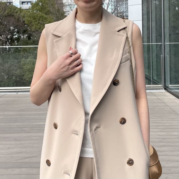 袖がない分気負わず羽織れるダブルブレスト。ジャケットを着ている感覚でも硬さは払拭‥ポケット付きです