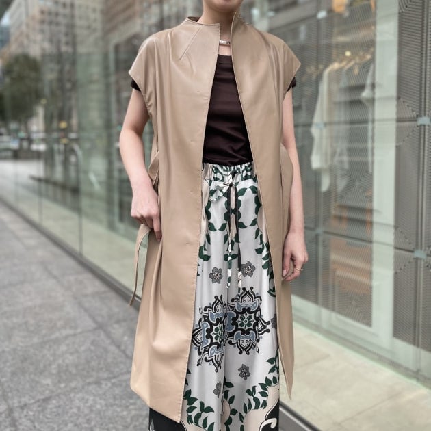 お次は、コーディネートのアクセントに。エリ元の詰まった立体的なシルエットが目を引くロングジレ。こちらは生地をフェイクレザー載せ替え別注した、スペシャルなアイテムです‥