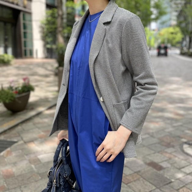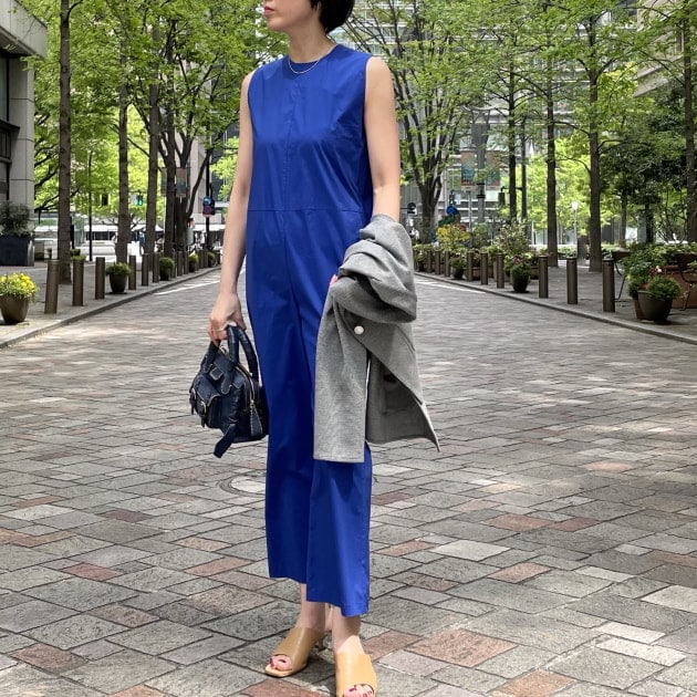 とにかく1着でコーディネートが決まるジャンプスーツ、身体のラインを拾わないのでこちらは着痩せも期待できそう。新緑が芽吹く春は硬さのないニットジャケットを合わせたコーディネートがおすすめです