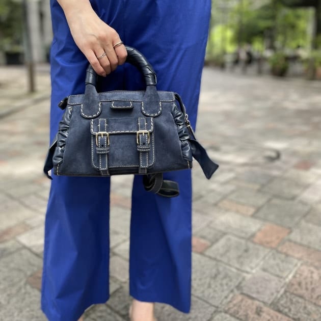今回のコーディネートは、ジャンプスーツのネイビーとバッグのネイビーをリンクさせたのもポイント‥