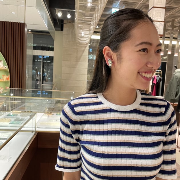 これから夏にかけて、シンプルなコーディネートの時にやはり少しデコラティブなアクセサリーはとても映えますね。顔まわりが華やかになります。イヤリングをお探しの方も多いので、アイテムとしても希少ですね。