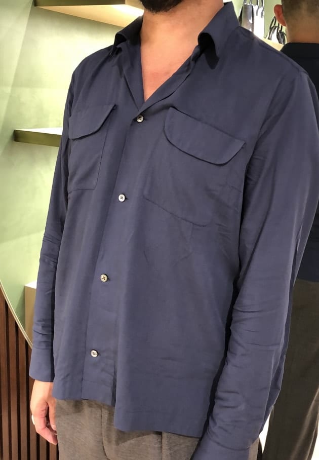 別注箇所はインラインモデルをベースに胸ポケットのボタンを省き、程よいスリムなシルエットに調整とのこと。
