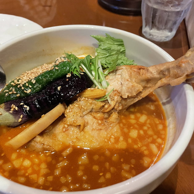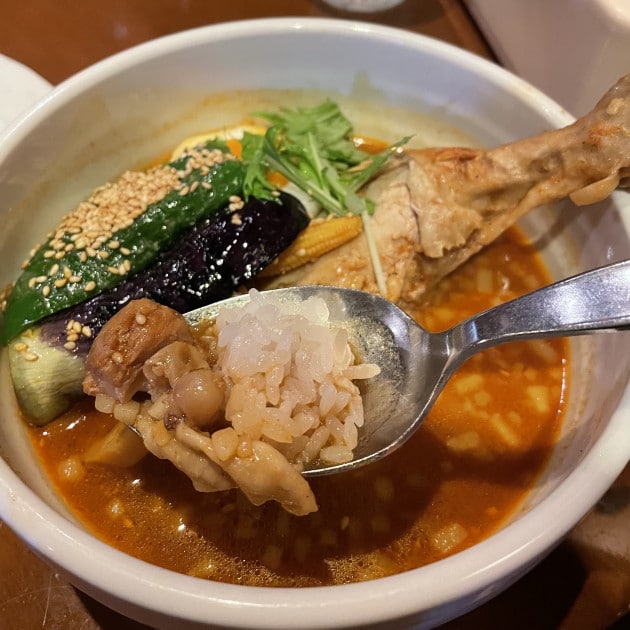 食べれば食べるほど、スパイス沼にハマるスープカレー。食べ進めるとジワジワ身体が温まりますが、まだ辛くしても良さそうです‥