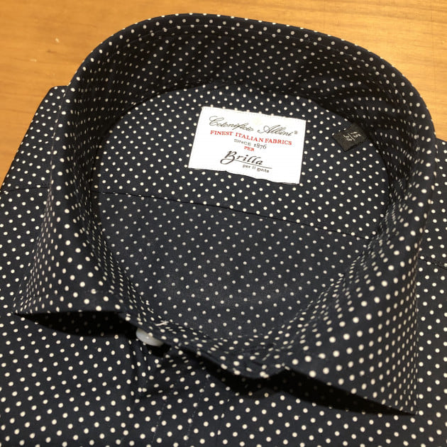 リネン生地で大好評なアルビニ社の生地を使用している<Brilla per il gusto>オリジナル。通年着用可能な薄手のコットンで、上品なドットのプリントです。
