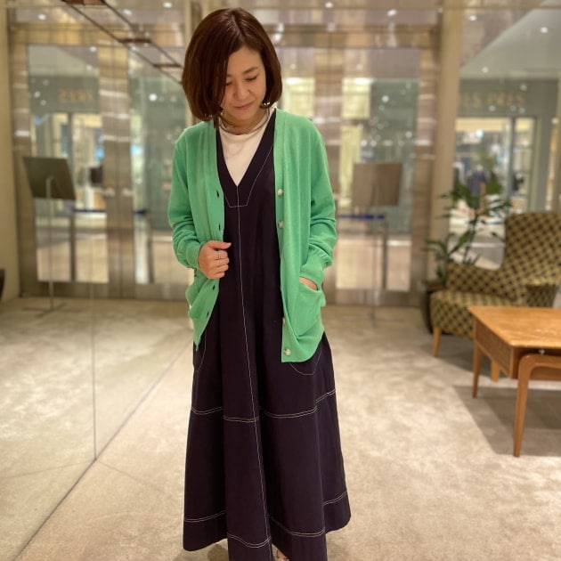 発色の良い鮮やかな色合いです、少しオーバーサイズ気味のゆとりのあるシルエットのカーディガンを着てもらいました