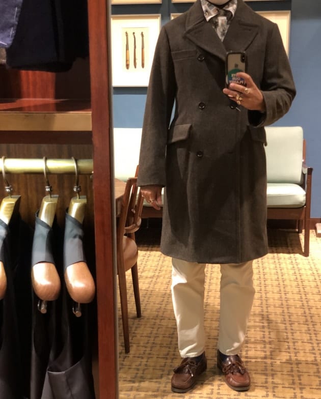 ジャケットに合わせてもいいのですが、ニットやカジュアルにスエットの上からカバっと着るのがストレートに良いのではないかと。