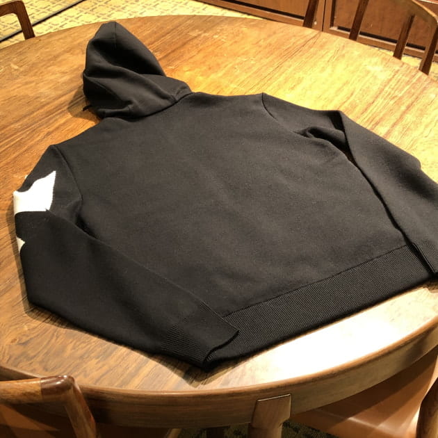 〈MONCLER〉ニット × ダウンパーカです。 薄手ニットのパーカーは、季節の変わり目にはアウターとして装え、寒さが厳しい時期にはジャケットやコートの下に重ねられます。