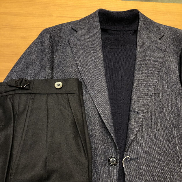 このLORO PIANA社ならではのしなやかなウール100%の生地がやはりステキですね。見た目はデニムながら、やはり上品です。