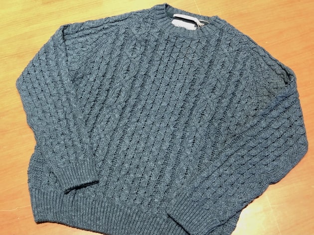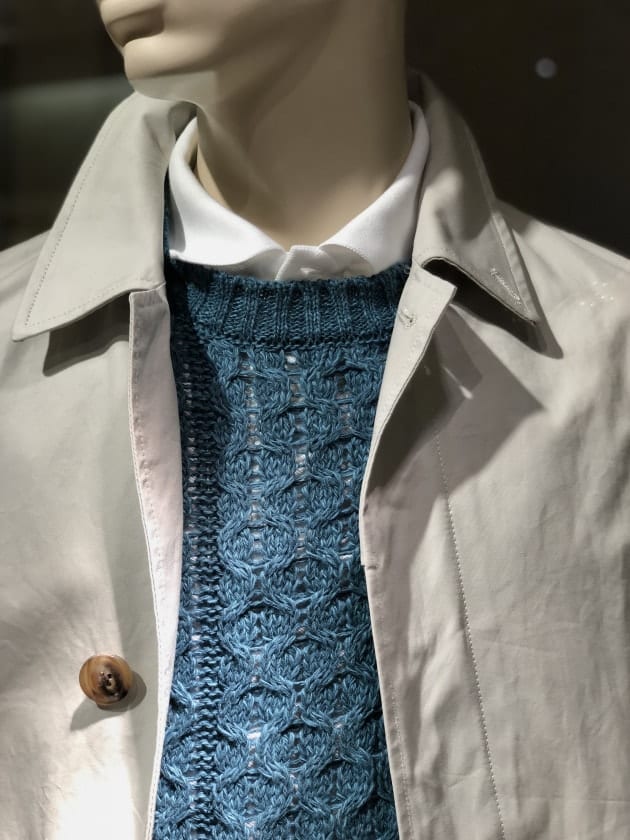 かなりドライタッチでザックリしたリネン・コットンのアランニットで雰囲気抜群なのですが、このDINGLEという落ち着いたターコイズブルーのようなブルーがたまらなく洒落ております…