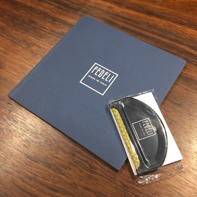 お買い上げいただいた方には、< FEDELI>のルックブックと毛玉取りを差し上げております。