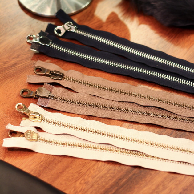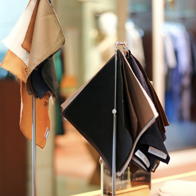 オーダーの流れは、①モデルの決定→②素材選び→③裏地やボタン・ファスナー等の副資材選び(→④必要に応じて袖丈と着丈の寸法調整)となります。