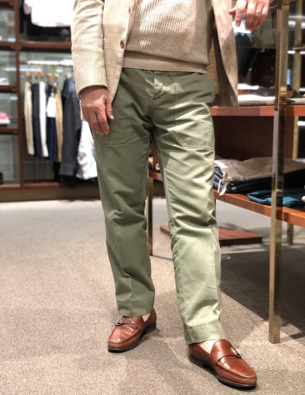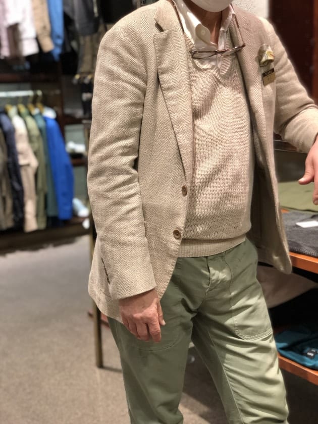 ベージュの素材感のあるジャケットに、素材感のある麻のベストを合わせていますが、オリーブのパンツも相性抜群です。
