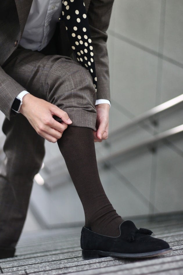 スーツのブラウンとシューズのブラックを繋ぐ、ブラウン×ブラックのロングホーズ。
