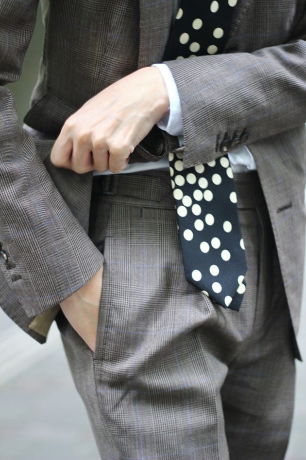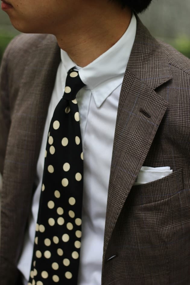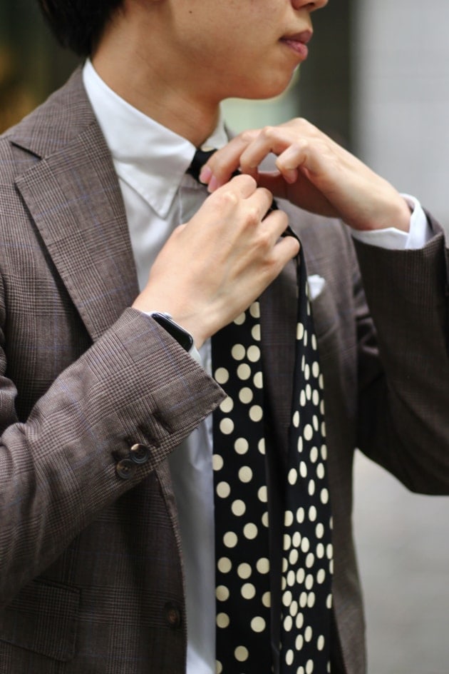 タイは、〈BEAMS F〉の遊び心のあるドットタイ。