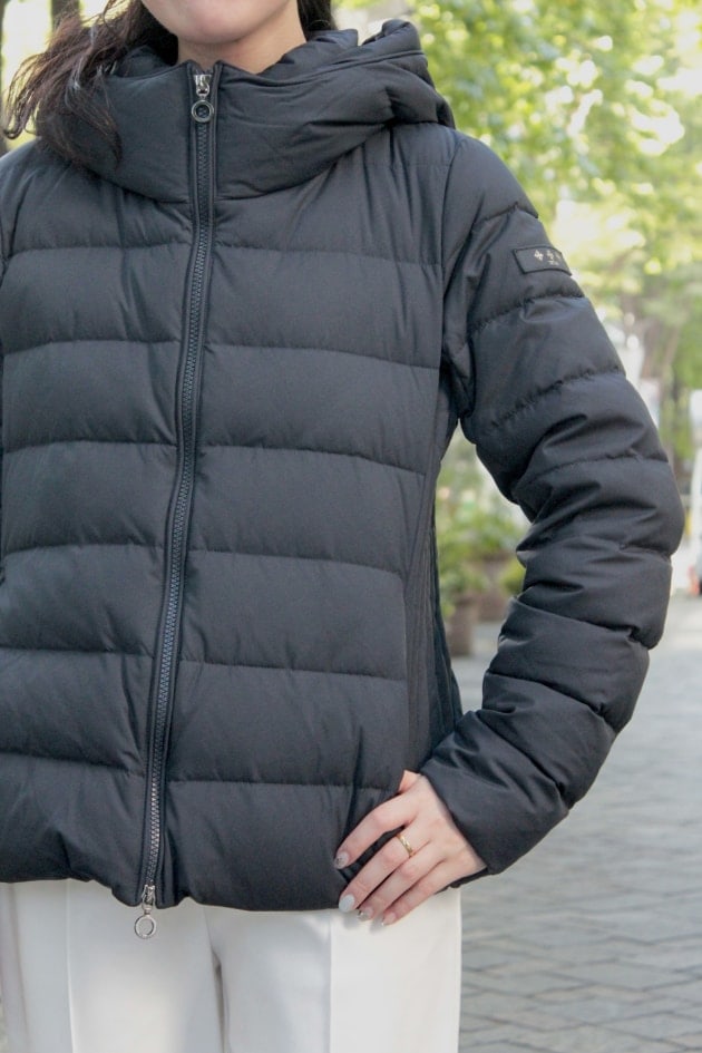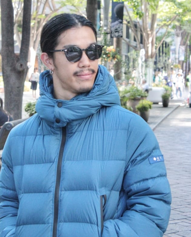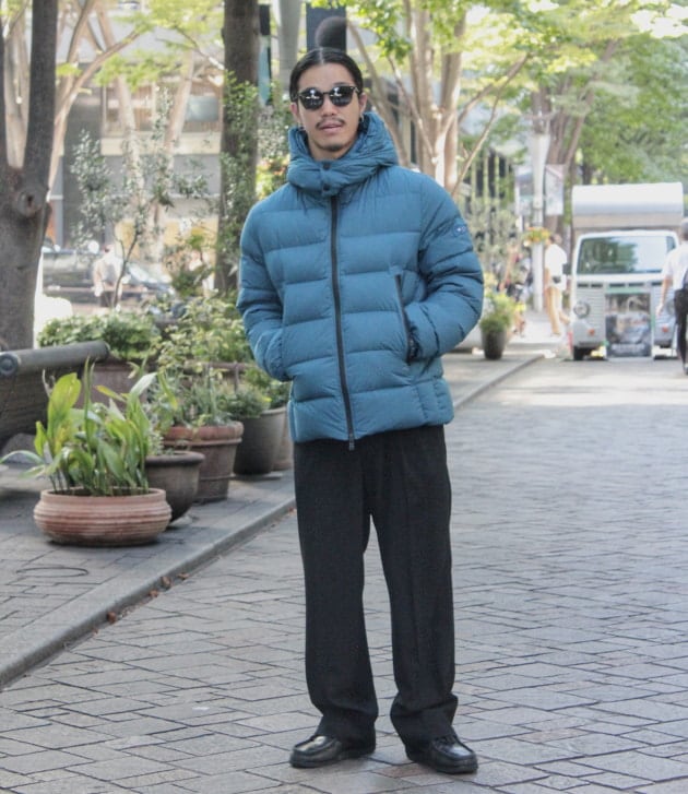 フードを被ったカットも残してもらいたかったOOURAが着ているのは、<TATRAS × Demi-Luxe BEAMS>のダウンジャケットです。