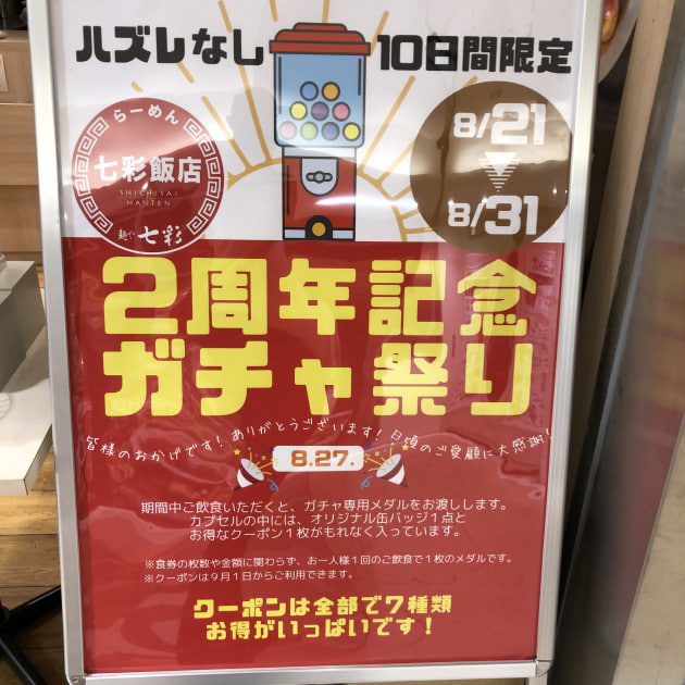 コロナ禍真っ最中にオープンされた七彩飯店さんですが、このたび2周年を迎えられ、現在ハズレ無しのガチャキャンペーン中です。