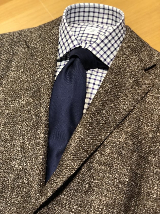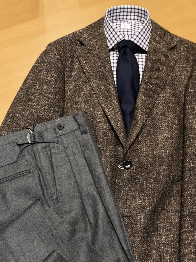 このシャツは、もちろんネイビーやグレー、モノトーン系のジャケットにも合うのですが、今回はブラウンで合わせてみました。