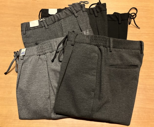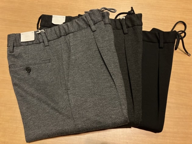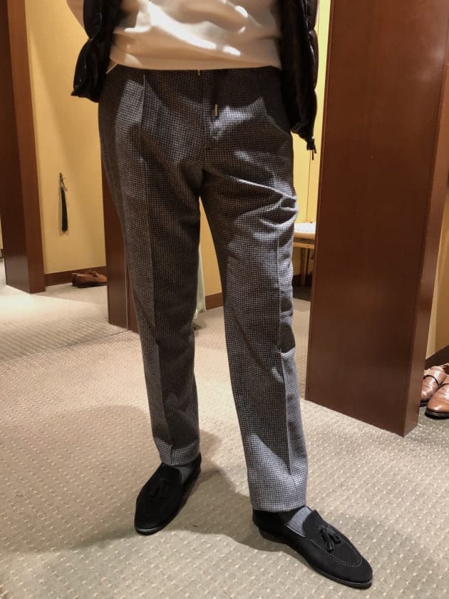 Y様は<giabsarchivio>のジャージーパンツを気に入っていただいておりまして、グレーの色違いをご所望だったのですが、穿かれているのが濃い方のグレー。更に濃いめのグレーがご希望とのこと…