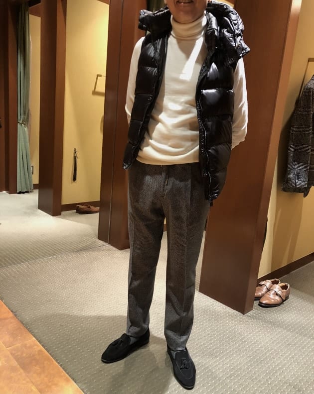このシリーズ、好評で無地のサイズ48がことごとく当店では切らしていたので…生地違いのハウンドトゥース柄で試していただきました。
