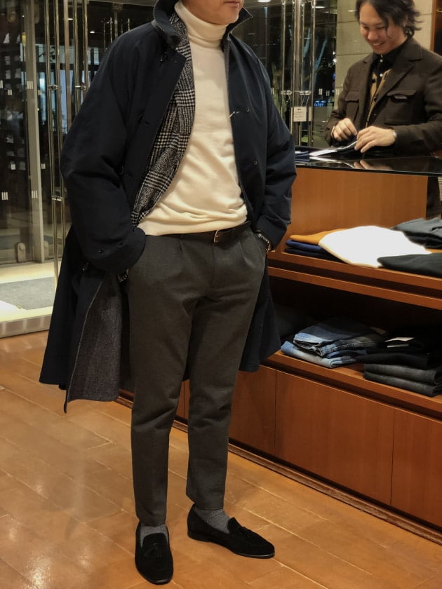 インナーのタートルネックカットソーは数えきれない位オススメしている<SLOANE>の人気モデルです。