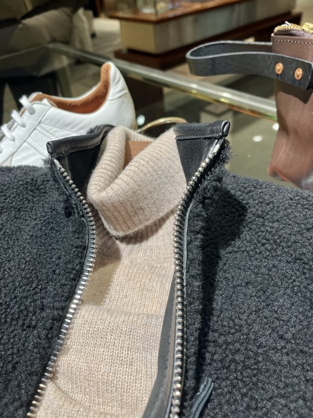 メインに持ってきたレザーベストのボアの柔らかさに、インナーのタートルネックはカシミヤで。