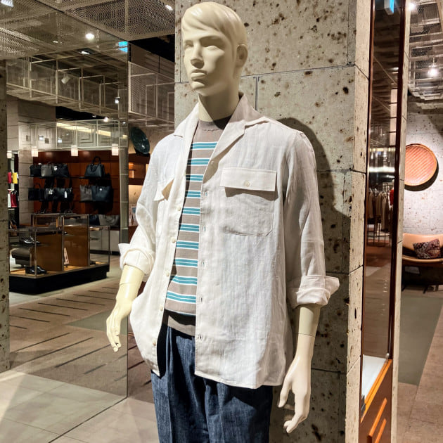 これから夏に向けてコチラのようなリネン素材も注目です。 サラリとした着心地はもちろん、見た目にも清涼感のあるシャツジャケットなら、この時季のアウター使いに最適です。暑い時は袖を捲って頂ければ、リネンシャツを羽織った感覚と同じです。