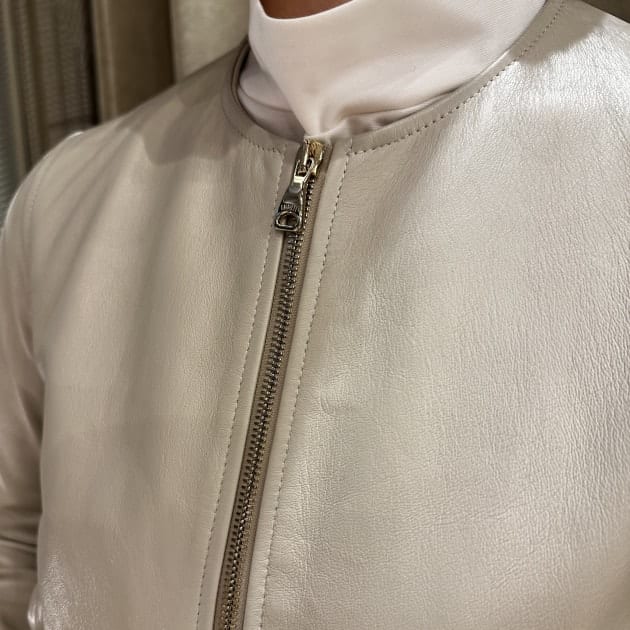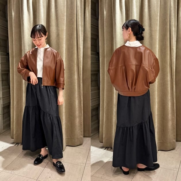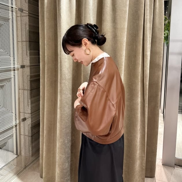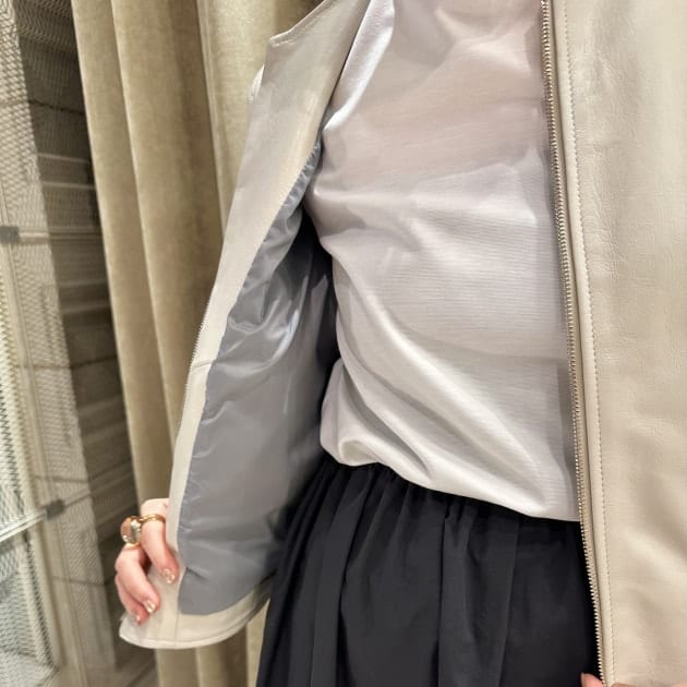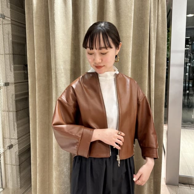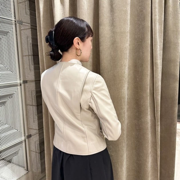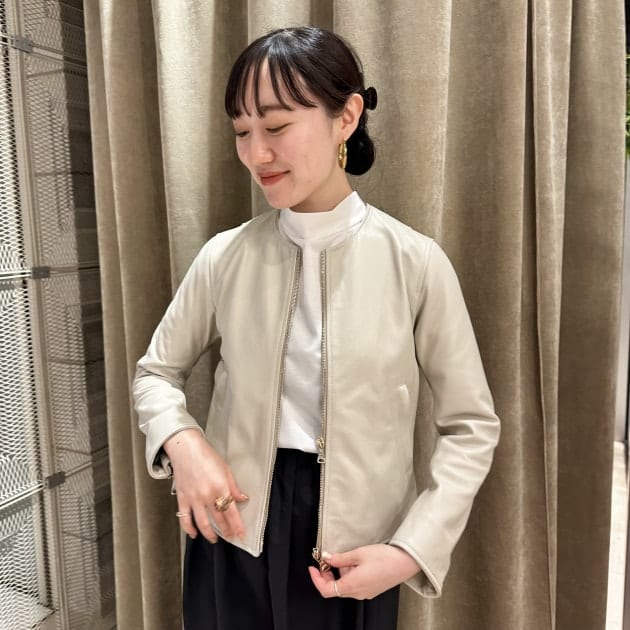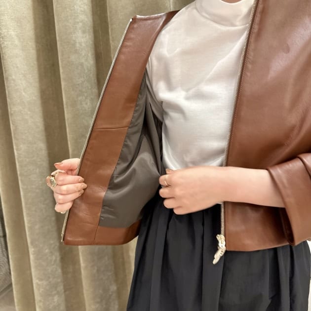 レザージャケット=強そうなイメージを持たれている方も少なくないと思いますが、ノーカラーだとグッと女性らしく着用出来ます。
