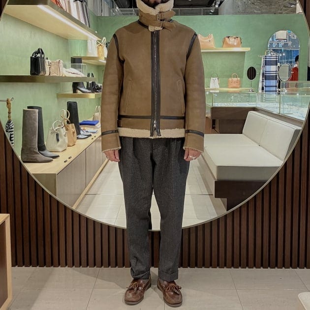 レザーアイテム好きのK様が試されていたのは、International Gallery BEAMSのイタリア製オリジナルブランド『QUATTROCCHI(クアトロッキ)』のムートンブルゾンです。