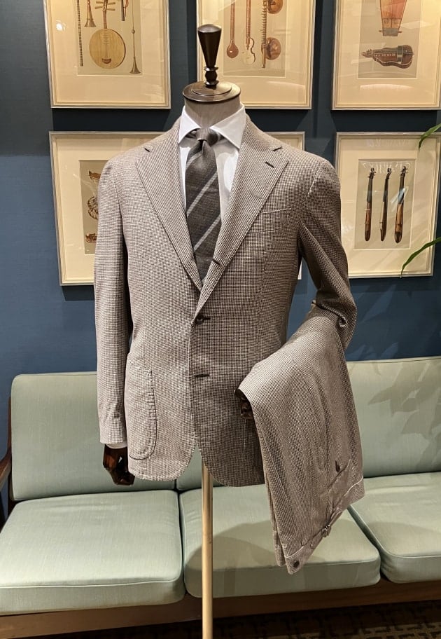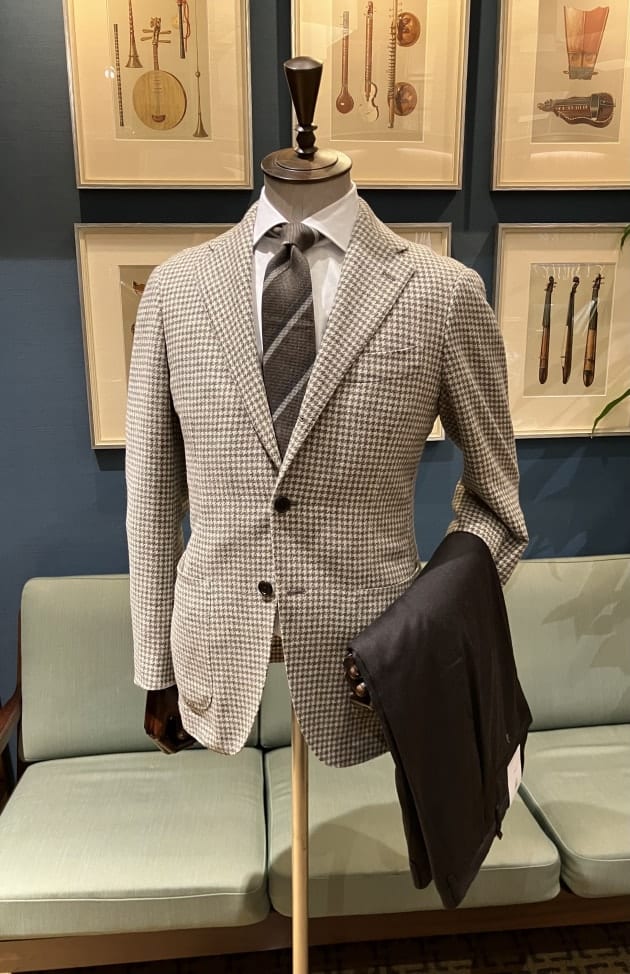 こちらは色違いのブラウンベースになります。ベースカラーを活かしたブラウン系のハウンドツース柄ジャケットのとコーディネートしてます。スラックスもブラウンにしています。