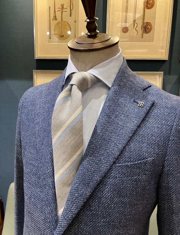 ネクタイの色目に合わせてジャケットも綺麗なブルーを合わせて見ました。