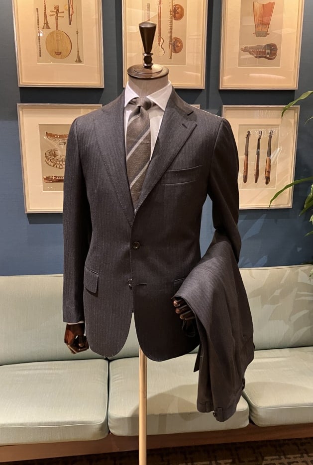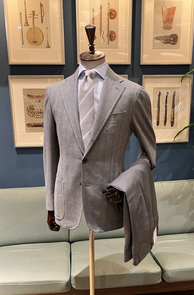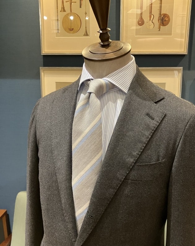 続いてグレースーツです。こちらはチャコールグレーのサキソニー素材です。起毛感のある素材とウール ネクタイとの相性は抜群です。