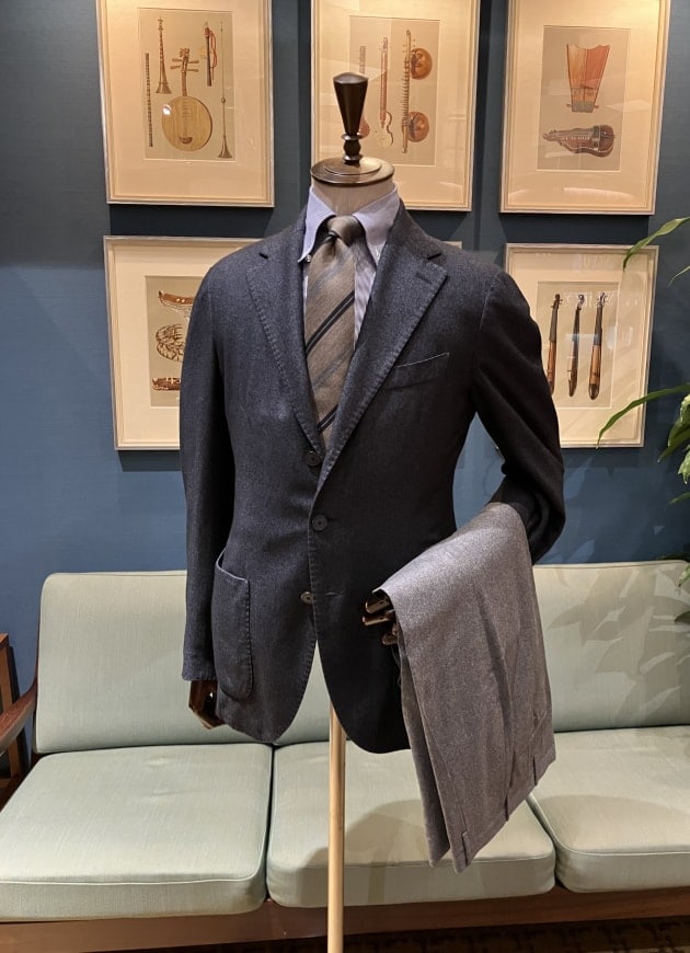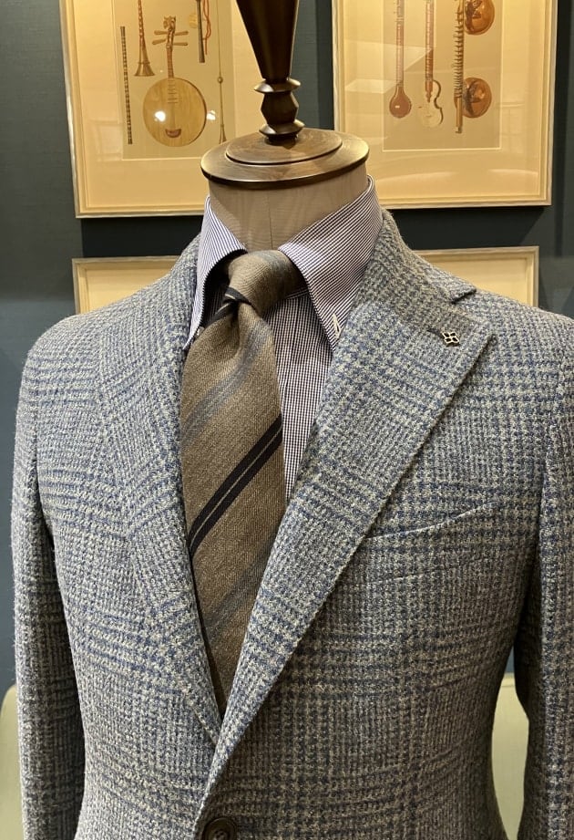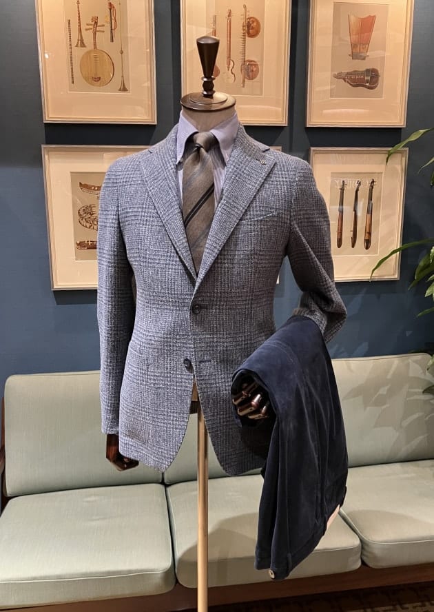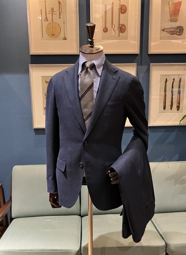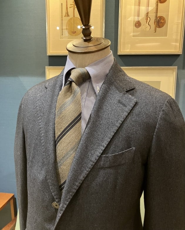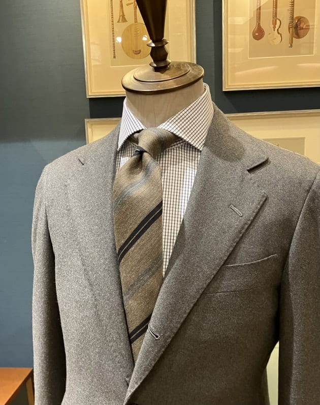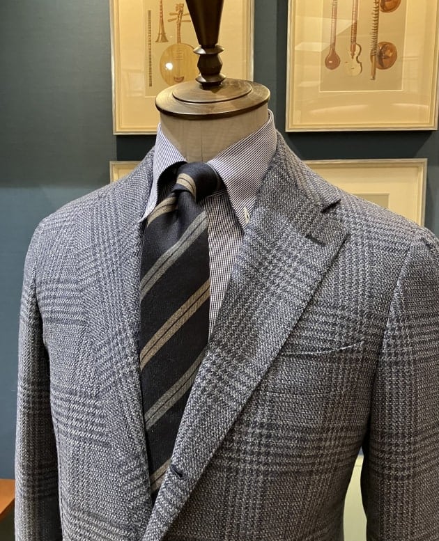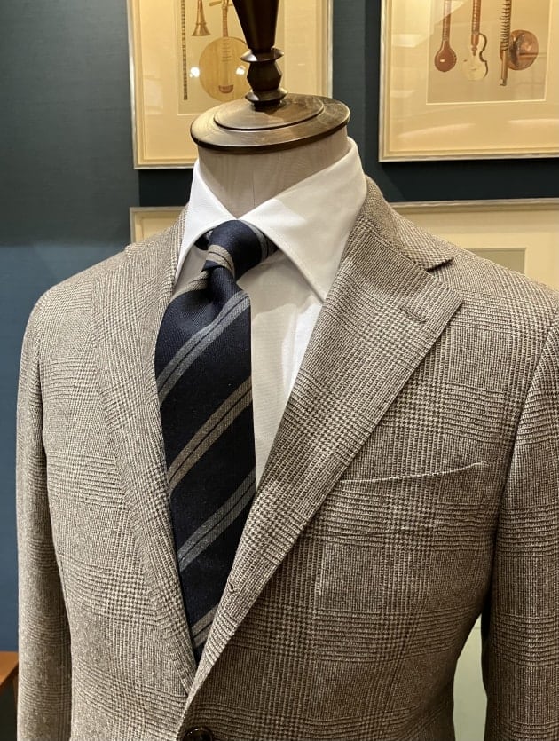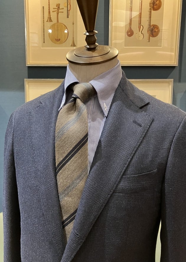 こちらのジャケットは、カシミア シルク素材で製品染めしており少しカジュアルな雰囲気の品です。もしタイドアップするのであれば、こちらの様なネクタイが相性抜群です。