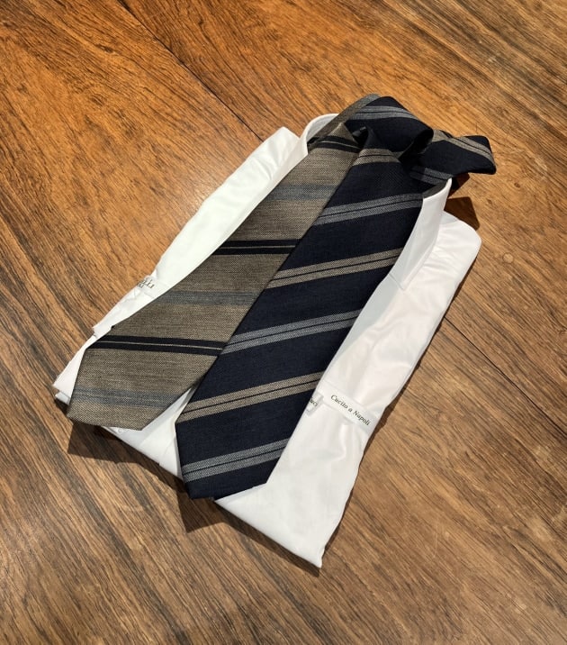 ブラウン、ネイビー、グレーなどのコーデュロイのジャケットやスーツをお持ちの方、こちらのネクタイがあるとタイドアップが容易になりますよ。