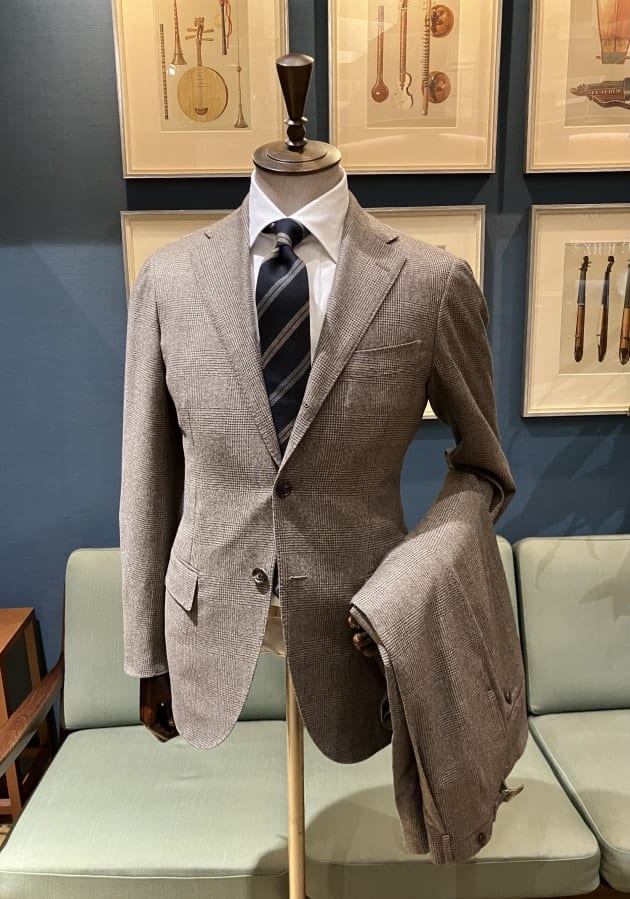 ブラウン系のスーツです。またもグレンチェックを選んでしまっていましたが無地物でも当然ですが相性抜群です。