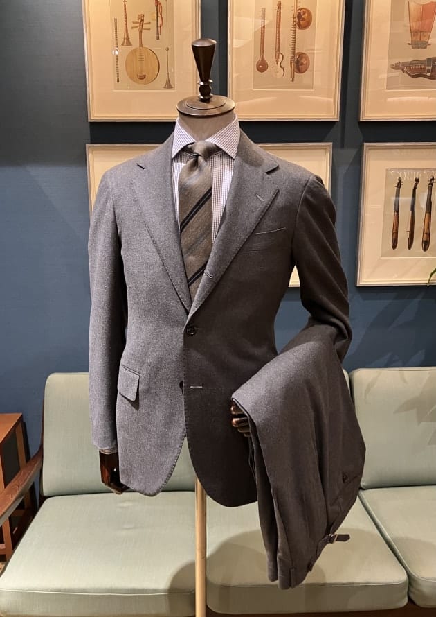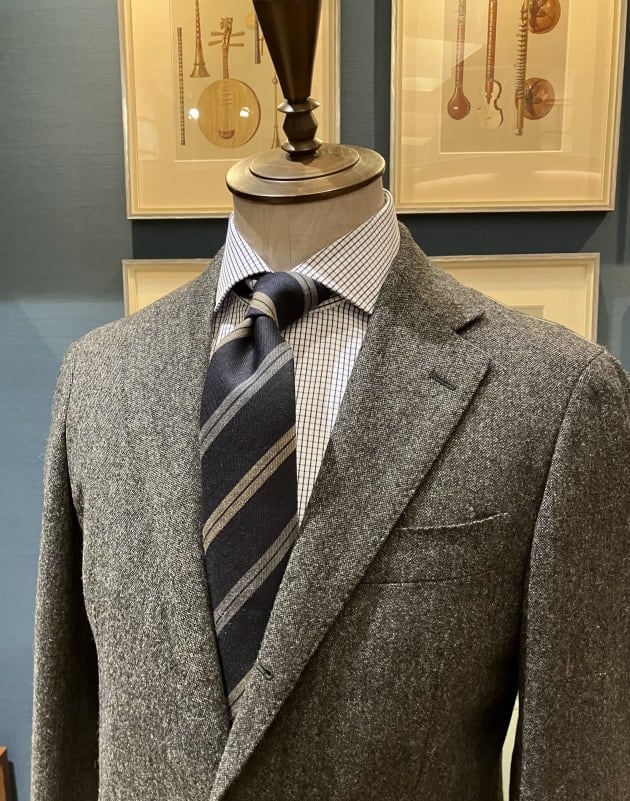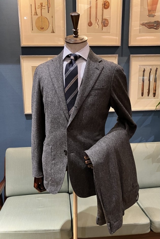 最後にチャコールグレーのホームスパン スーツとのコーディネートです。ハリスの様なツィード感が強い素材との相性はネクタイの風合いが上質な為、良くないですがソフトツィーディーな素材であれば大丈夫です。