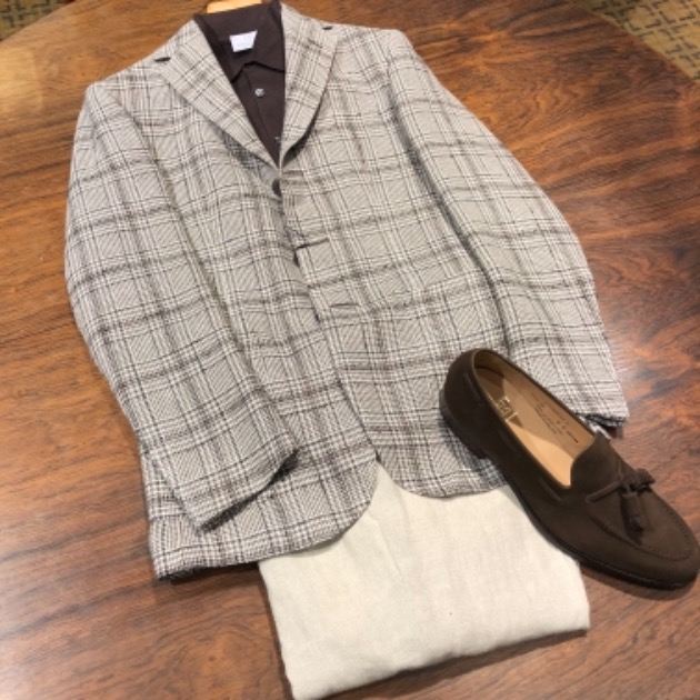 ベージュですと、足元はスエードのローファーのような軽めのシューズを合わせ、こんな感じで同系色のコーディネートをするとかっこ良さそうです。