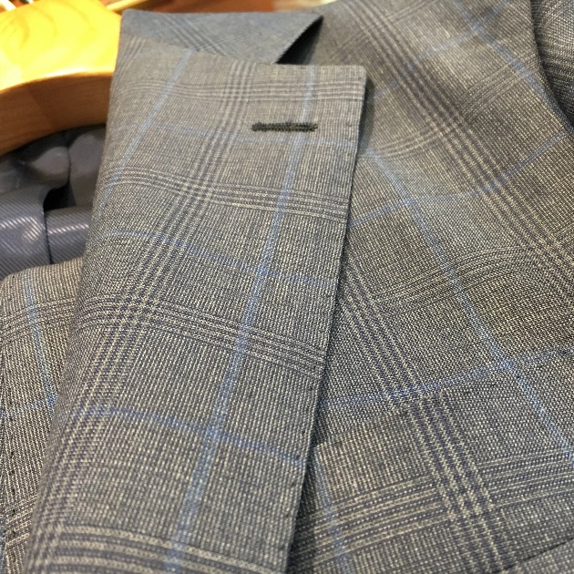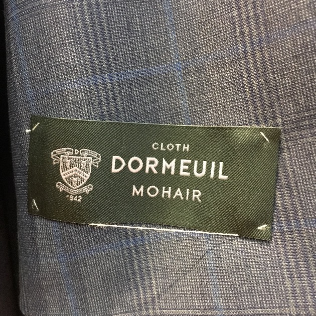 <DORMEUIL>の生地。そりゃあ雰囲気良いはずですよね。グレンプレイドの入り方も沈んだ感じで、最近人気の傾向です。